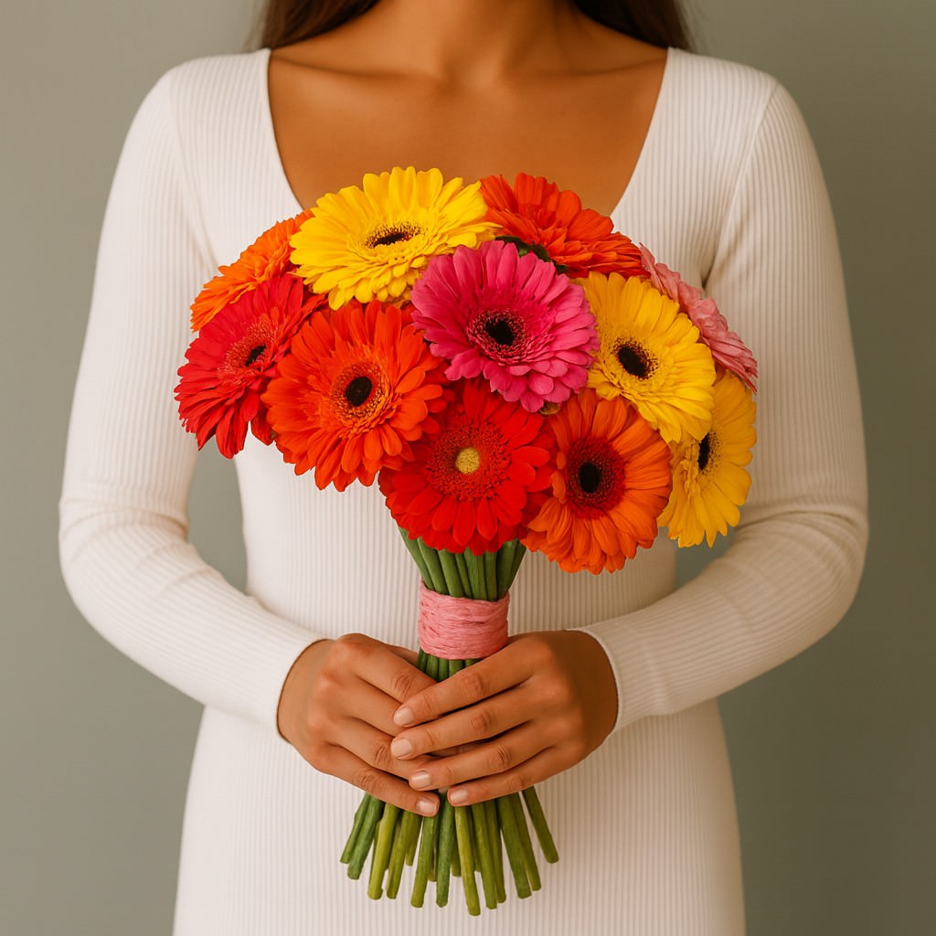 Эффектный букет из махровых гербер в яркой палитре оттенков — от солнечно-жёлтого до насыщенного розового и красного. Живые, объёмные цветы создают впечатление свежести и радости, а розовая лента придаёт композиции нежный акцент.