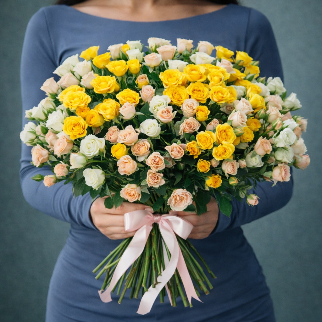 Букет «Солнечный поцелуй» — яркая и жизнерадостная композиция из нежных кустовых роз, сочетающая тёплые солнечные и мягкие кремово-персиковые оттенки. Этот букет словно наполнен светом, теплом и лёгкостью, создавая атмосферу уюта, заботы и искренней радости. Идеальный выбор, чтобы подарить хорошее настроение и выразить тёплые чувства без лишних слов.