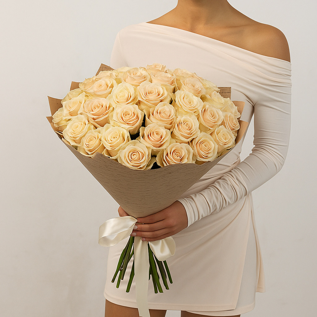 Изысканный букет из кремово-персиковых роз станет идеальным подарком для выражения нежности и заботы. Его мягкие оттенки подчеркнут особое отношение и создадут атмосферу уюта и тепла.