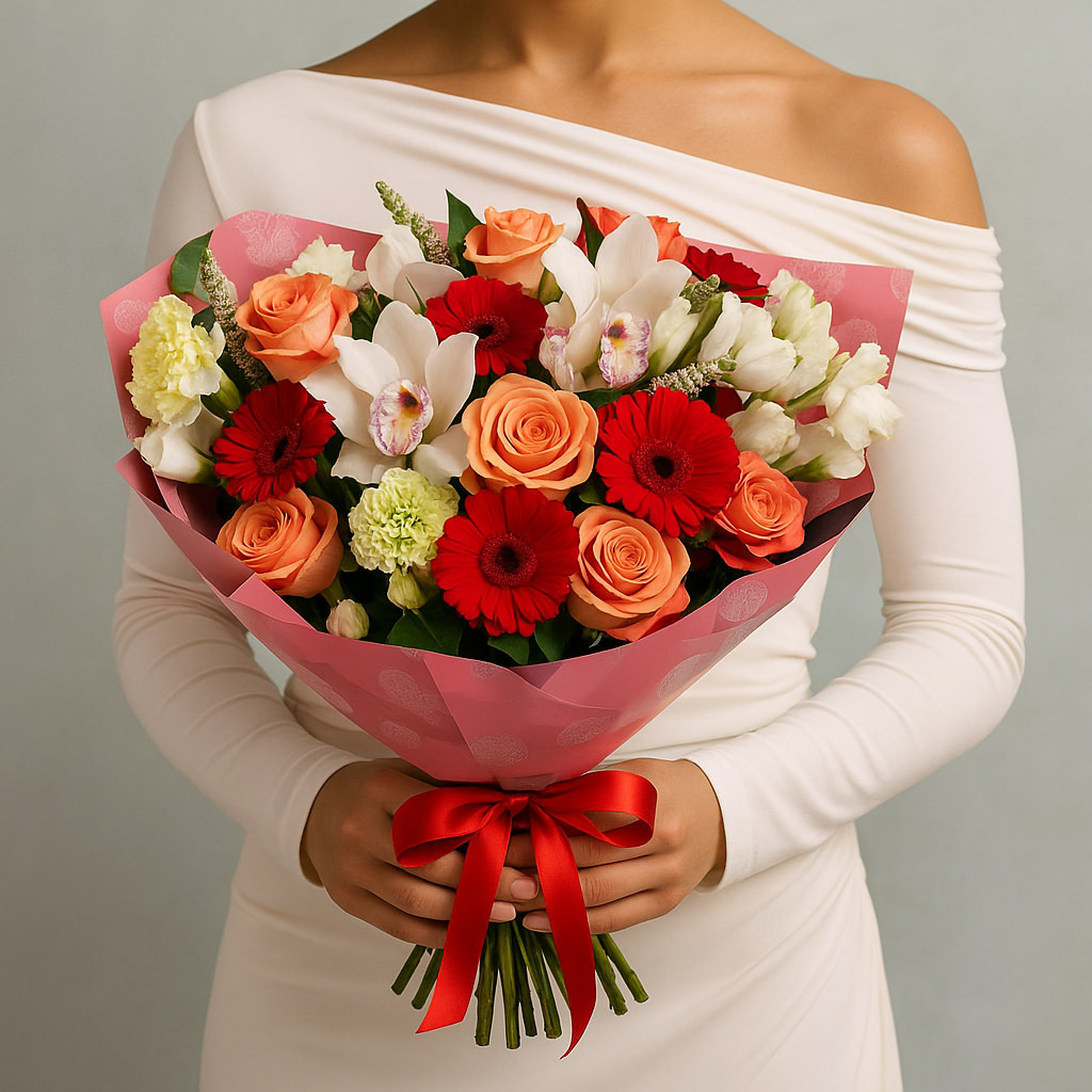 Эффектный букет в насыщенной красно-белой гамме с добавлением нежных пастельных оттенков. Орхидеи, розы и герберы создают гармоничное сочетание роскоши и свежести. Такой букет станет идеальным подарком для особого случая, подчеркнёт искренние чувства и оставит незабываемое впечатление.