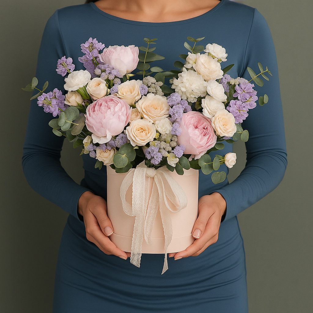Цветы в коробке «Нежная акварель» - букет, который привлекает внимание своим уникальным оформлением и необычным цветовым решением
